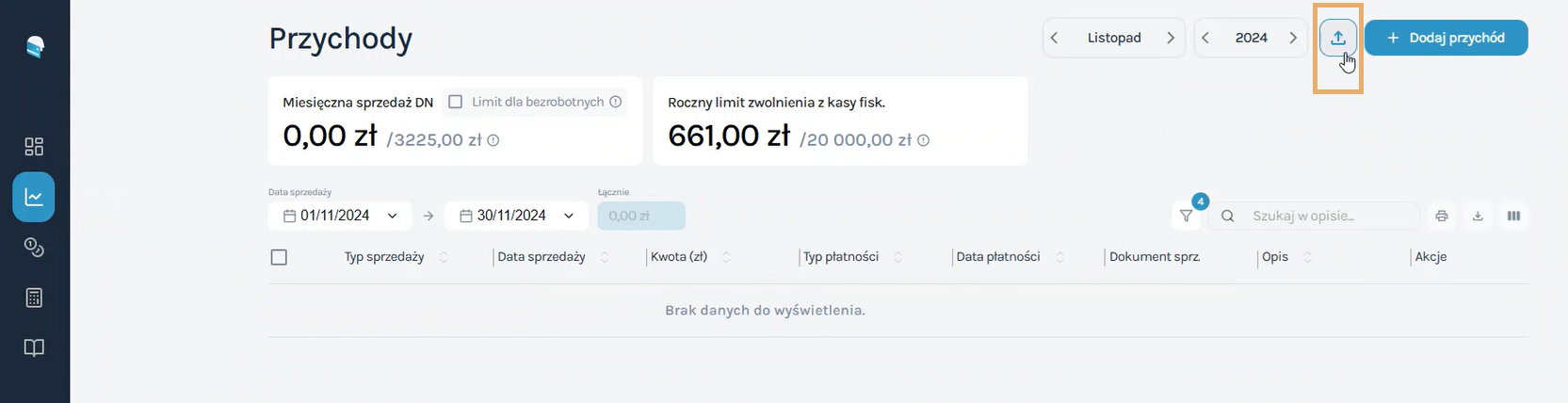 5. Kliknij na przycisku strzałki w górę w prawym górnym rogu (obok przycisku „+ Dodaj przychód”):