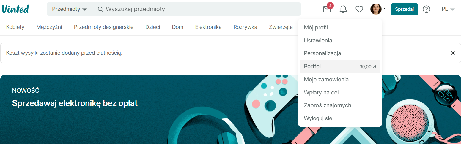 1. Zaloguj się do swojego profilu, kliknij na zdjęcie profilowe i z rozwiniętego menu wybierz „Portfel„: