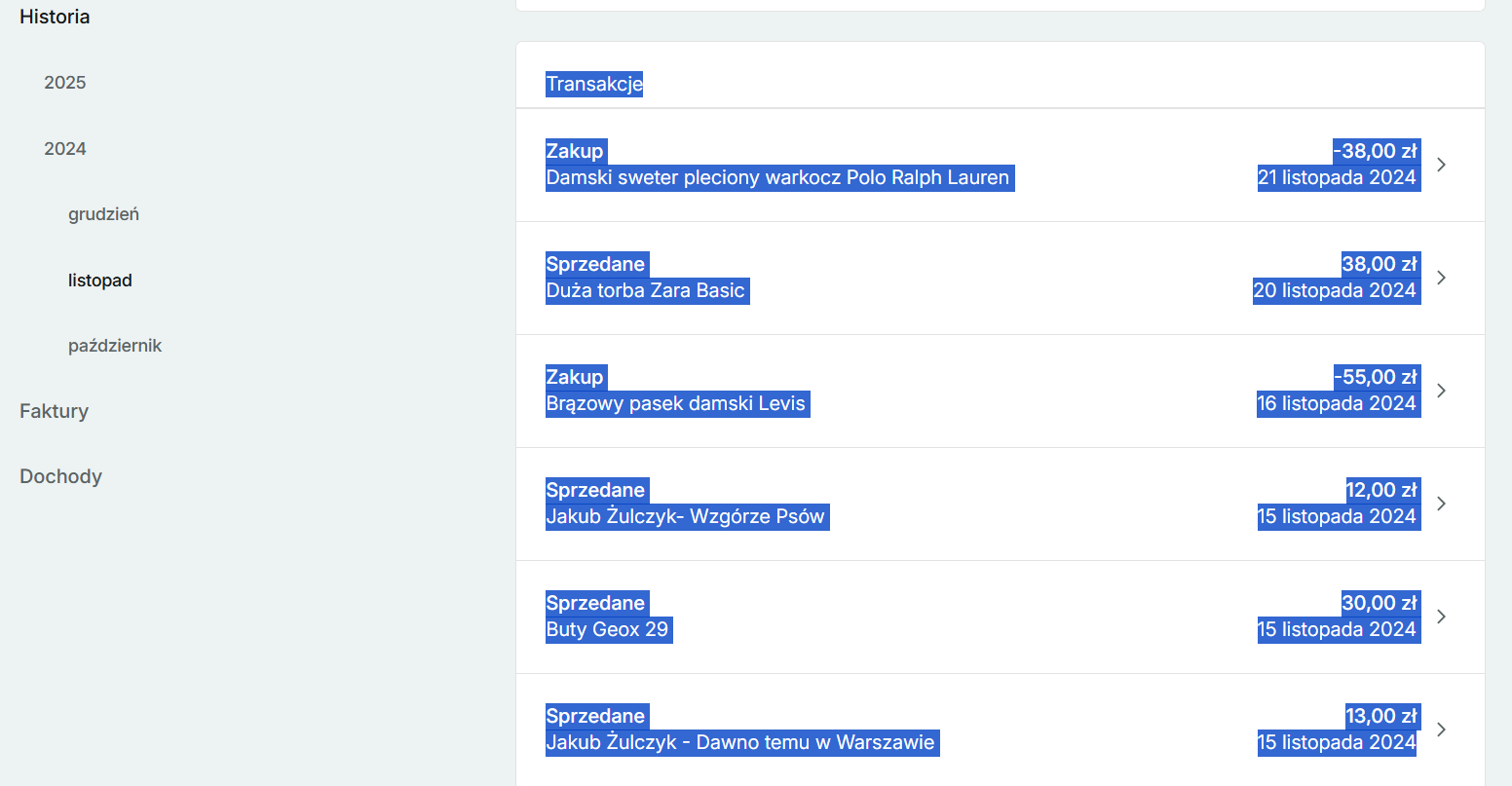 3. Zaznacz kursorem wszystkie transakcje, które chcesz zaimportować. Nie musisz pomijać transakcji „Zakup” lub „Zwrot kosztów” – zostaną one pominięte automatycznie. Po zaznaczeniu transakcji kliknij wciśnij Ctrl + C.