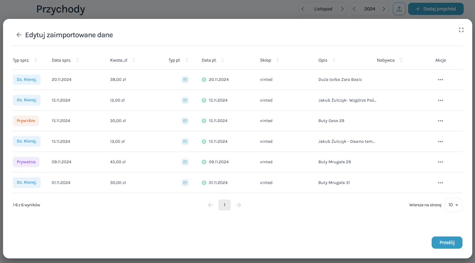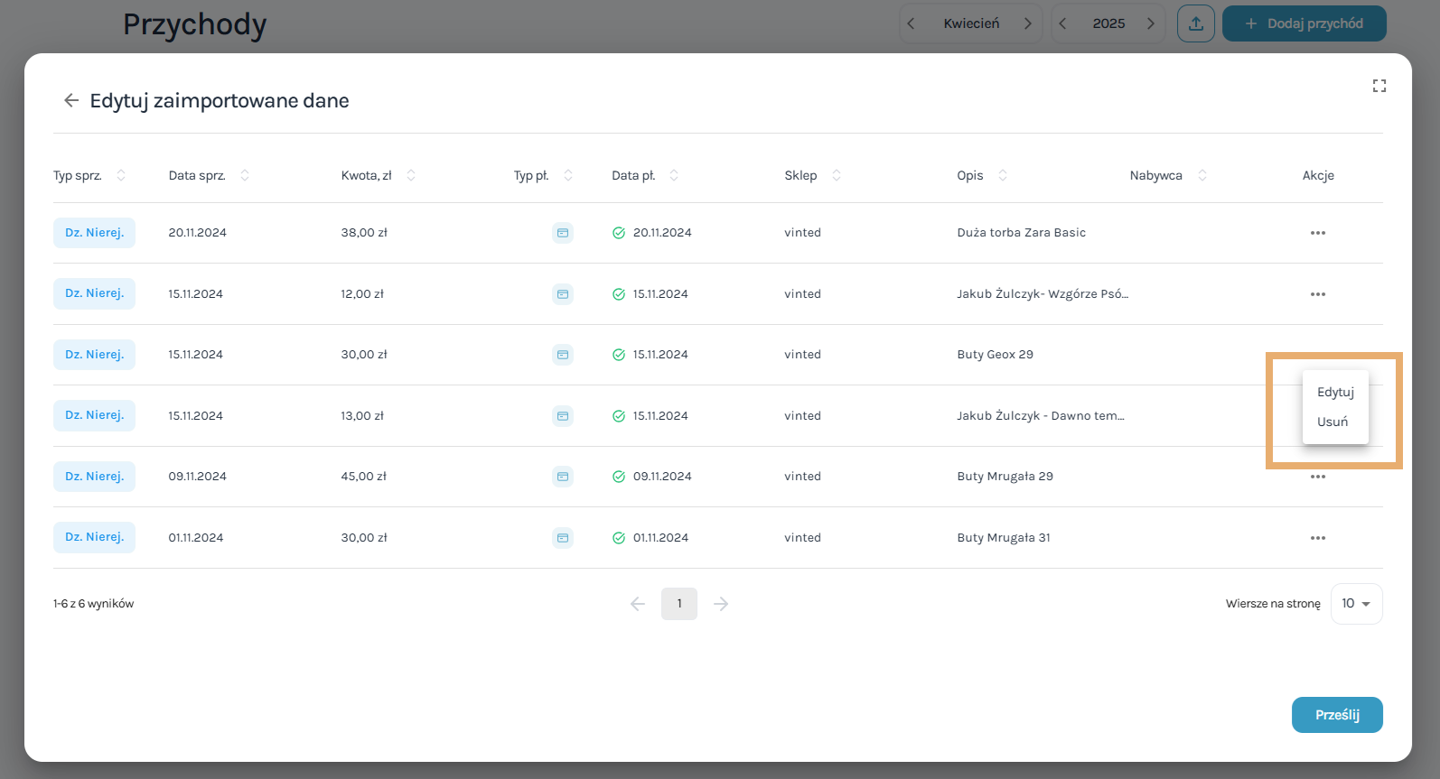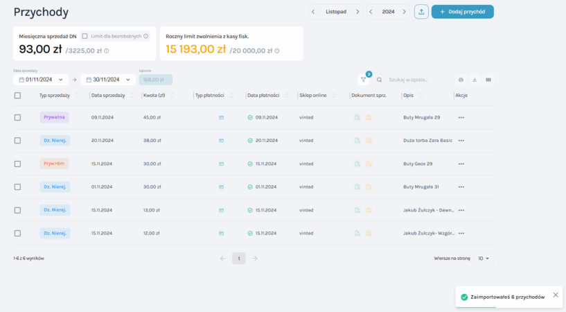 Gratulacje! Twoje transakcje z Vinted za wybrany miesiąc zostały skutecznie zaimportowane do ewidencji sprzedaży: