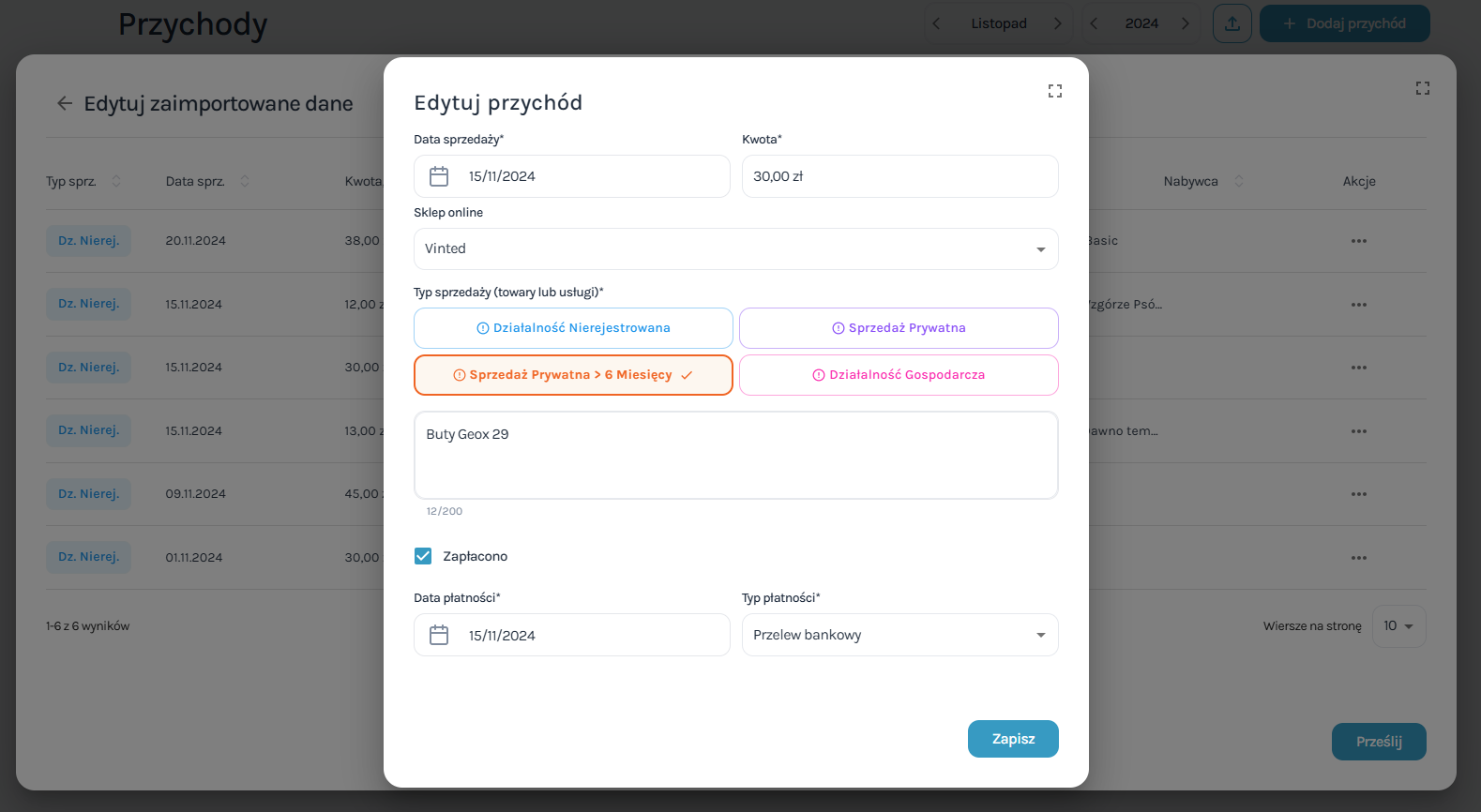 9.  Po otwarciu formularza edycji możesz zmienić typ sprzedaży i m.in. wybrać „Sprzedaż prywatną” (sprzedaż przed upływem pół roku od zakupu – opodatkowaną) albo „Sprzedaż prywatną > 6 mies.” – nieopodatkowaną. Możesz też zmienić opis transakcji.