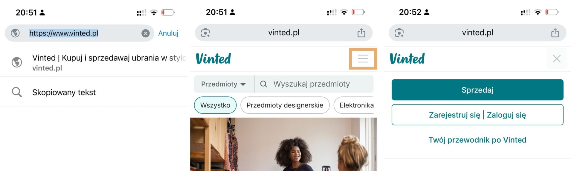 1. W przeglądarce internetowej w telefonie lub tablecie wpisz adres: vinted.pl. Nie przechodź do aplikacji Vinted – korzystaj z mobilnej wersji strony internetowej. Zaloguj się do swojego profilu, kliknij na zdjęcie profilowe i z rozwiniętego menu wybierz „Portfel„: